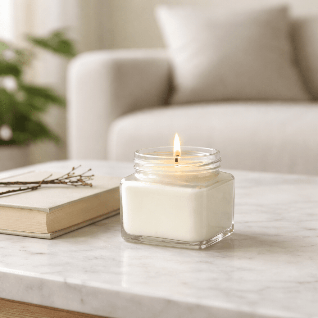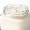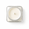 Pequeña vela en frasco de vidrio cuadrado con tapa.