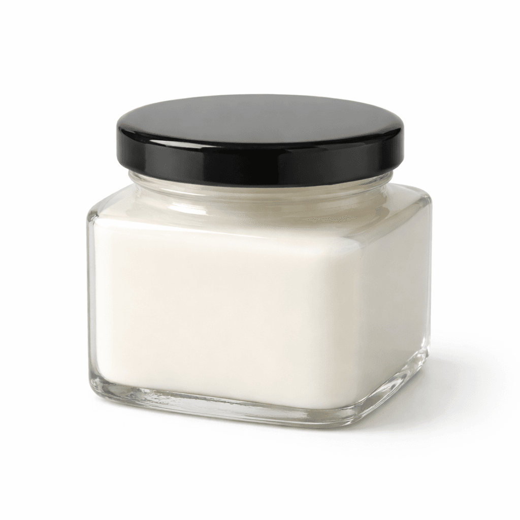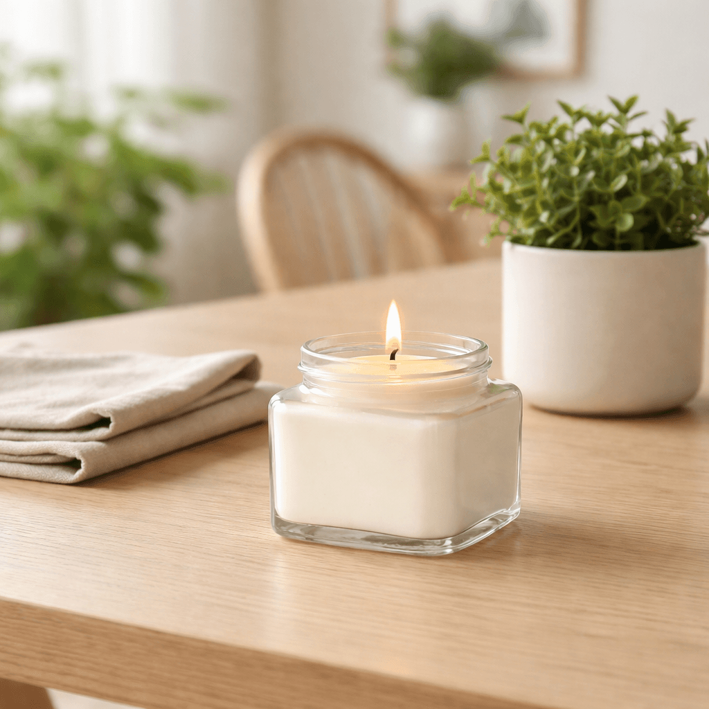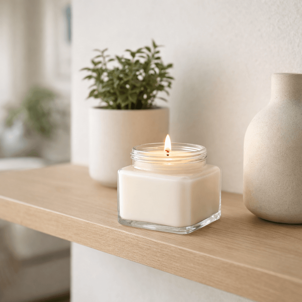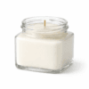 Vela artesanal de cera de soja 100% natural en frasco de vidrio cuadrado con tapa metálica negra. Colores pastel. Aroma suave. Perfecta para regalos pequeños y recuerdos de eventos.