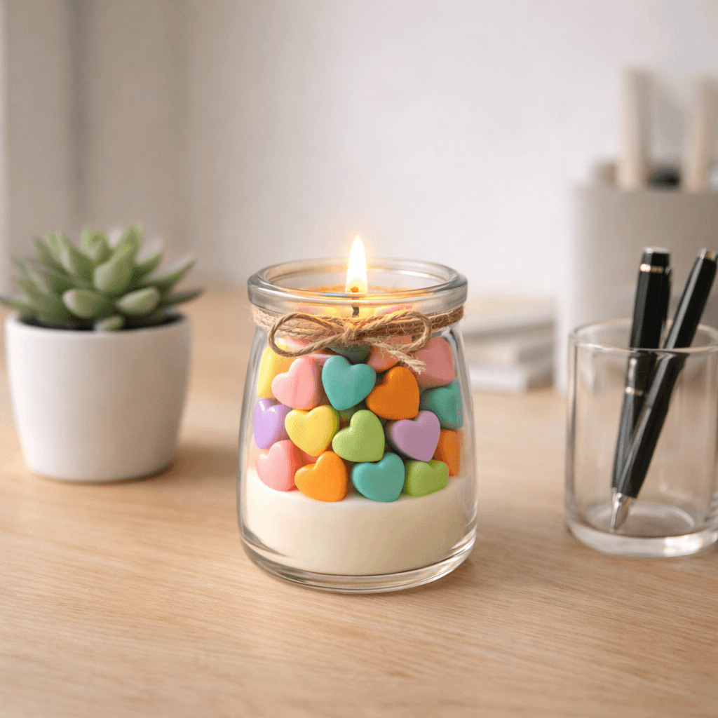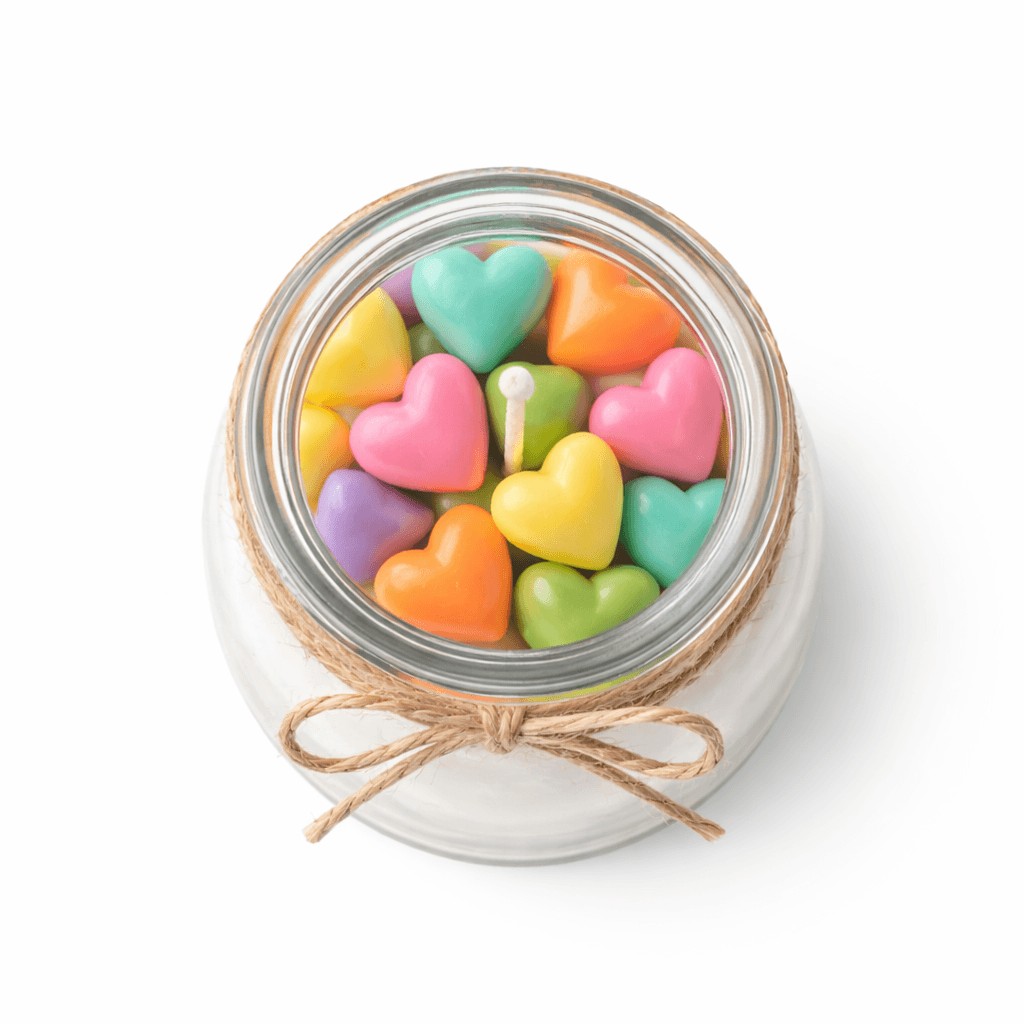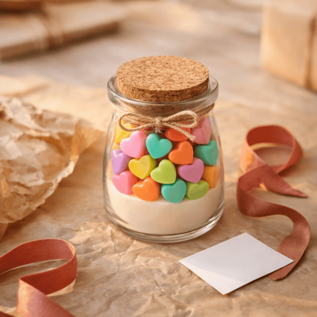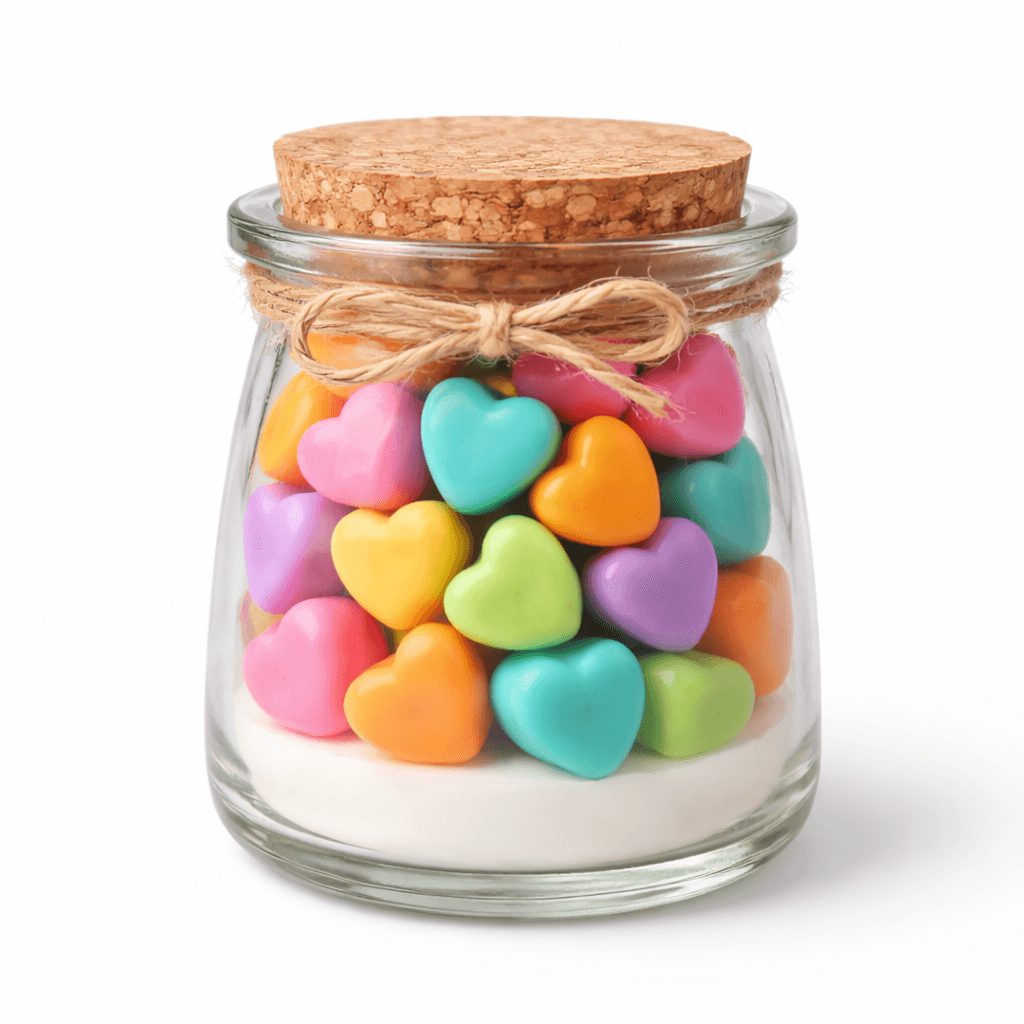 Encantador frasco de vidrio tipo farmacia lleno de cubitos de cera de soja de colores y aromas variados. Tapa de corcho artesanal. Fragancia con aceite esencial Ylang Ylang doTERRA. Etiqueta ‘Be Yourself’. Ideal como regalo llamativo y original.